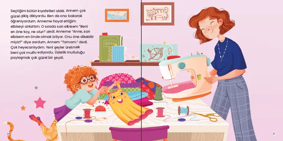‘ Çevremizdekileri mutlu etmek istiyorsak bizi mutlu eden bir eşyayı onlara vererek ya da bizi mutlu eden bir oyunu onlarla oynayarak da mutluluk dağıtabiliriz. İstersen eski bir eşyanı sevdiğin birine hediye ederek bunu deneyebilirsin. Eskiden kullandığın bir elbise, ayakkabı, kitap, çanta, oyuncak... Böylece hem karşındakini mutlu etmiş olursun hem de kendini. Aynı, bu mutluluğun elbisesinde olduğu gibi...’ Duru bu macerasında mutluluğun elbisesini dikiyor. Peki, sen mutluluğunu paylaşmak için neler yaparsın?